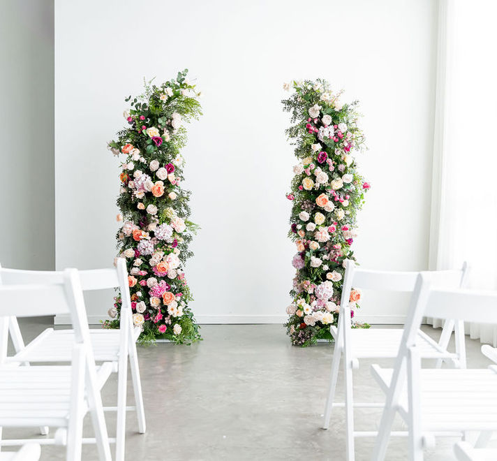 Our Demi Two-Piece Floral Arch is a vibrant statement piece, designed to bring a burst of summer color to your ceremony or event. Lush greenery forms the foundation of this freestanding arch, accented with bold, seasonal florals in bright, cheerful hues. Whether framing your “I do” moment or creating a picture-perfect photo backdrop, Demi adds a fresh, romantic feel to any celebration.